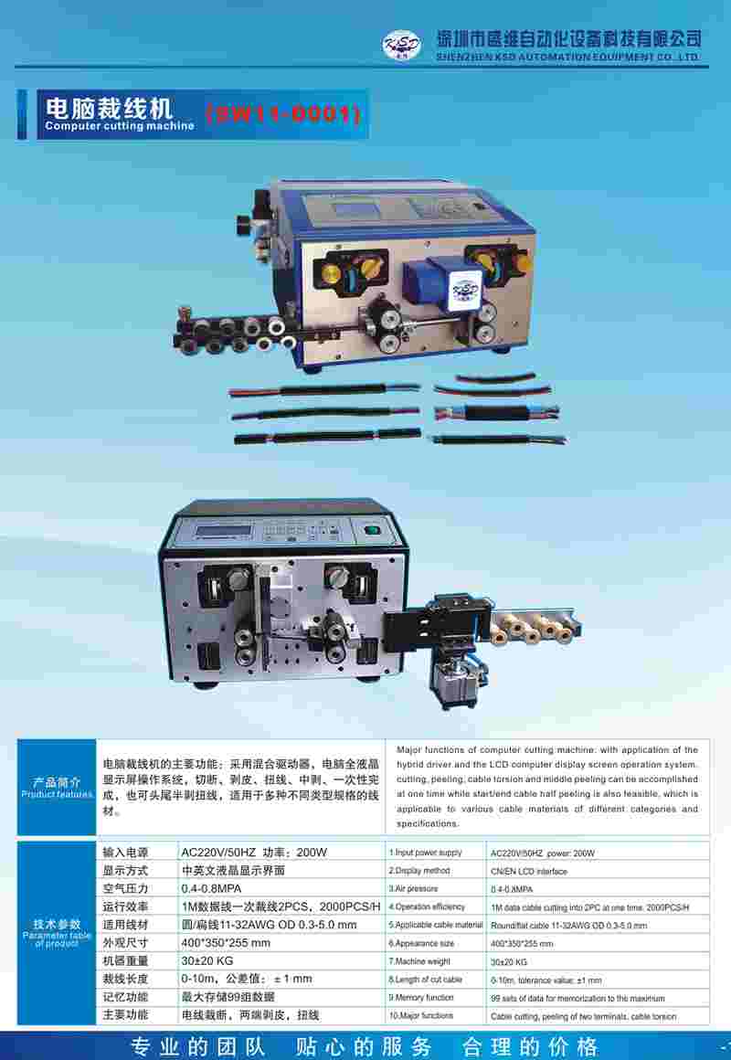 电脑裁线机的主要功能:采用混合驱动器,电脑全液晶显示屏操作系统,切断、剥皮、扭线、中剥、一次性完成,也可头尾半剥扭线,适用于多种不同类型规格的线材。